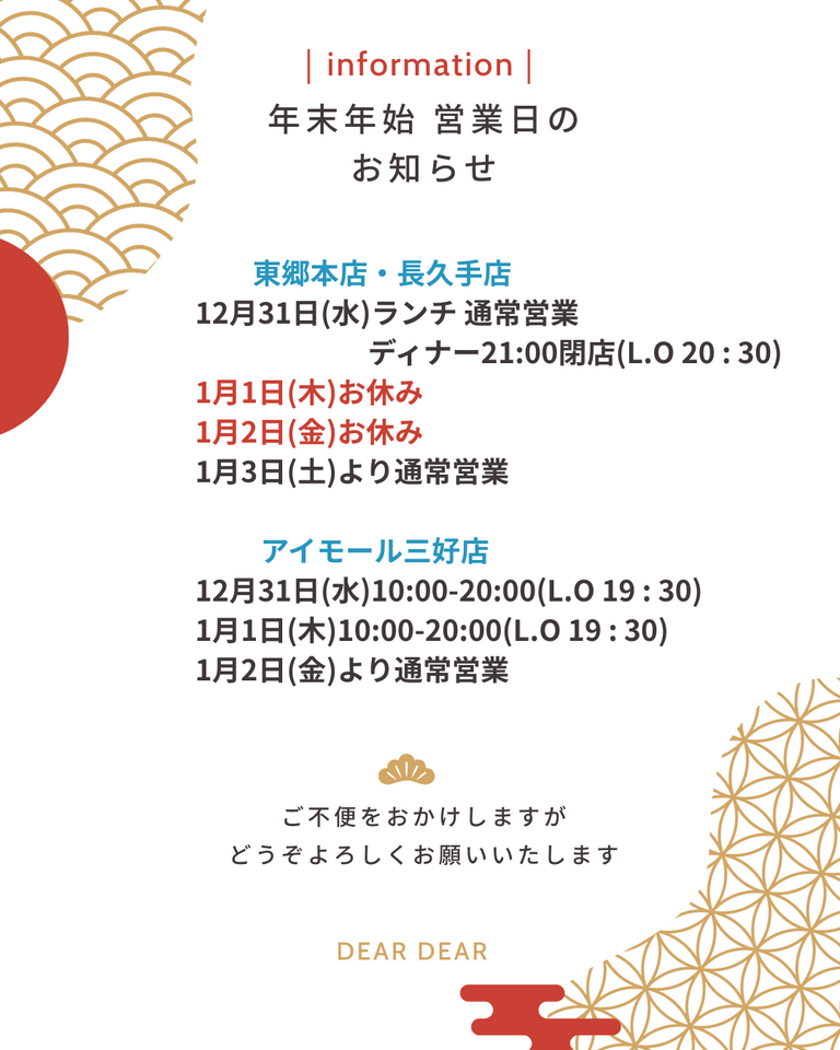 1月1日(木) 10:00-20:00(L.O 19:30)